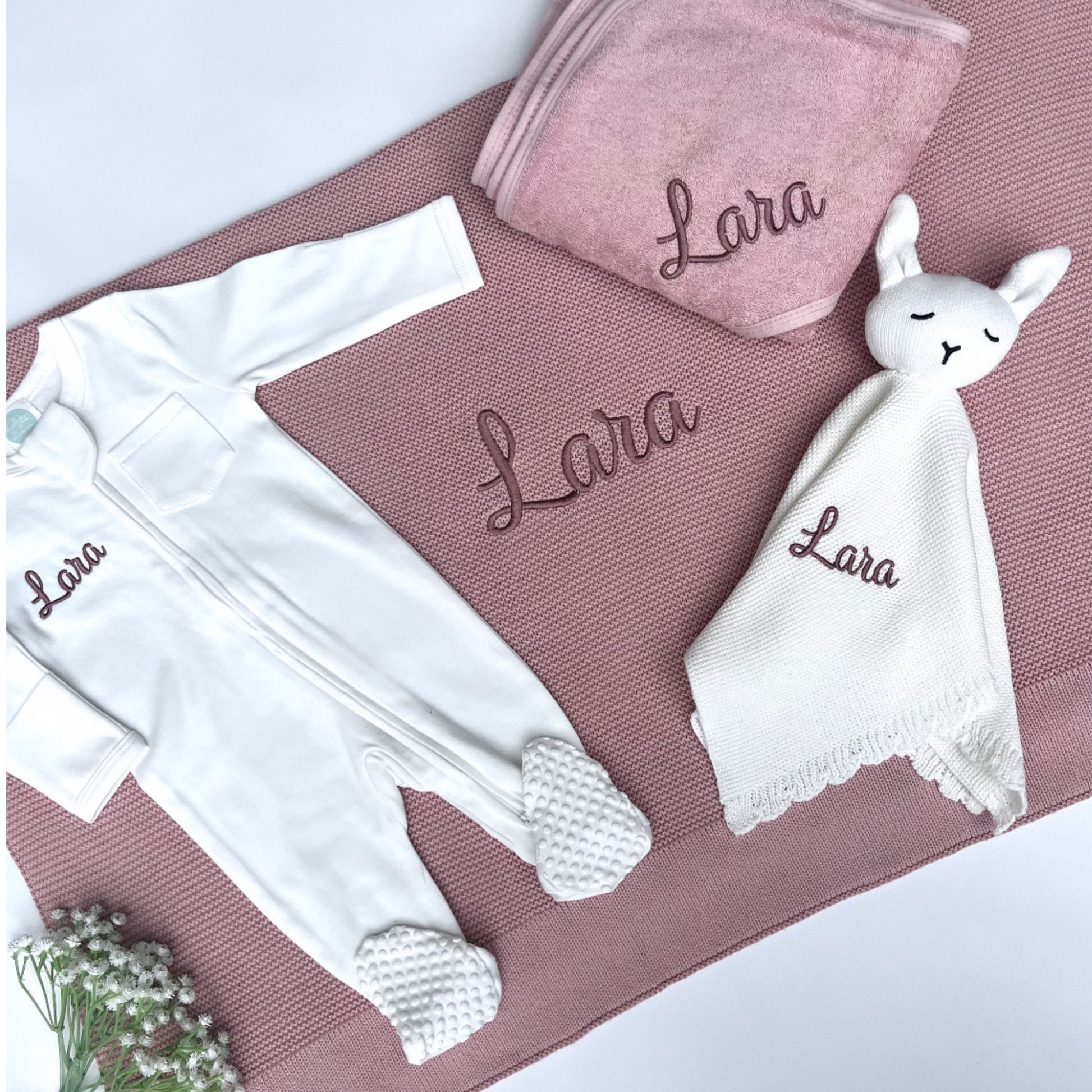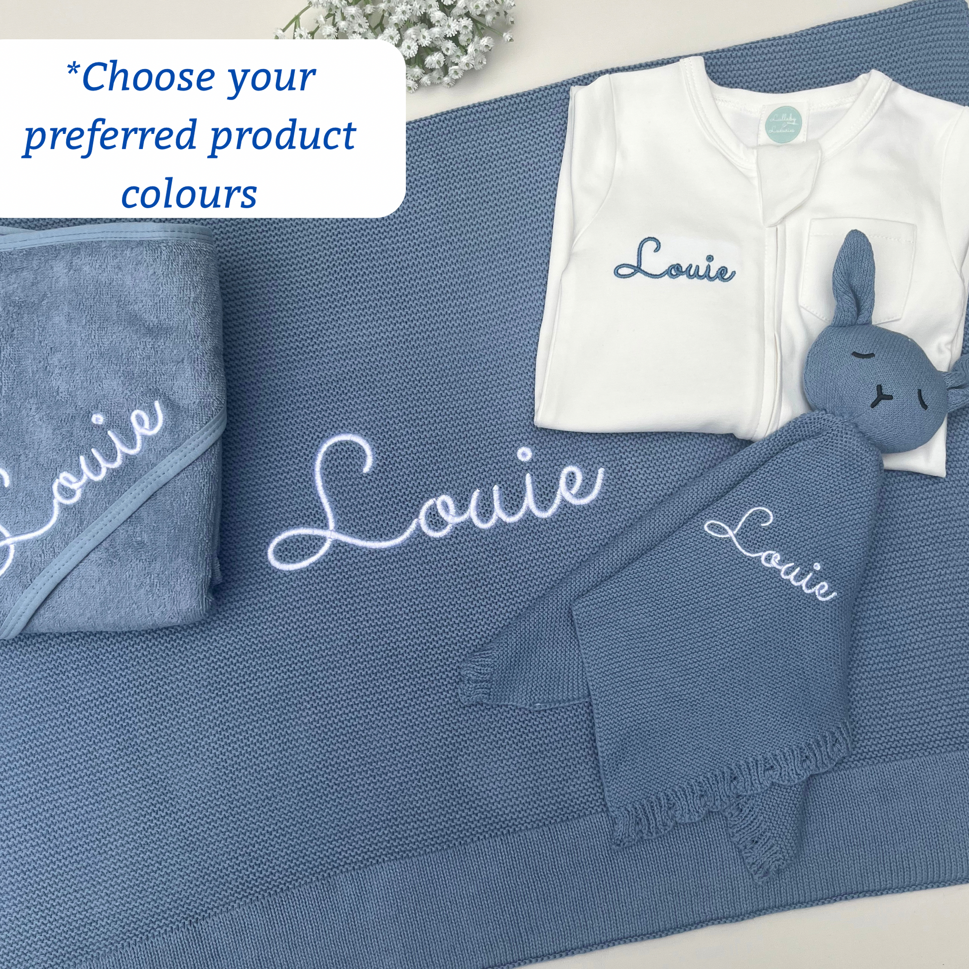 All items are expertly embroidered with your selected thread colour, creating a unique and cherished keepsake. Ideal for new parents, baby showers, and christenings, this luxury baby gift set is sure to impress!